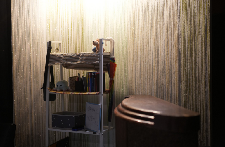 《第3回公演「ネバーランド・コンプレックス」舞台セット・棚にどんな小道具を置くかはキャストを中心に話し合いました》