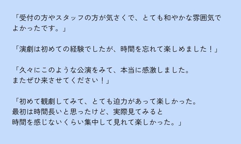 私たちの公演にご来場いただく方の約半数は、観劇経験が「ほとんどない」もしくは「初めて」の方です。そういった方々にもリラックスしてお楽しみいただける空間作りを心がけております。