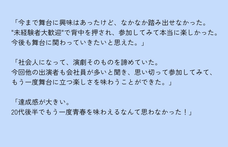 「社会人になって舞台に立つことを諦めていたが、もう一度挑戦してみたい方」など、