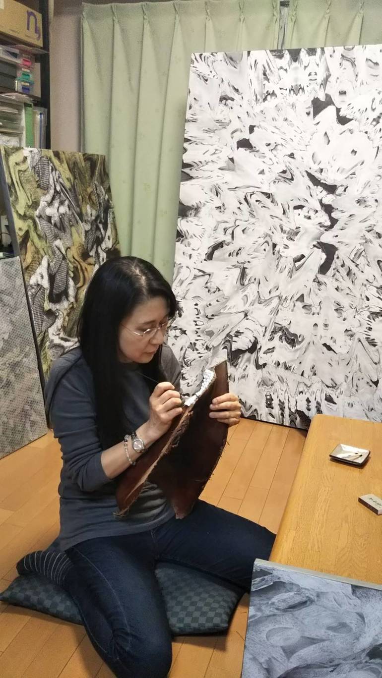 ・阪神・淡路大震災の時には大阪府豊中市にいました。マンションが全壊して、自分が生かされているという気持ちを持ちました。被災による様々な体験の中でも、私にとって大きな転機となったのは鷲見康夫先生という『具体美術協会』のメンバーの先生と出会ったことです。被災のネガティブな体験の中で、これだけは異彩を放つものでした。鷲見先生は私の『どうせ才能がない』という卑屈な自己暗示を驚くほど簡単に解き放ちました。目からうろこが落ちると言いますが、いえいえ、まるで全身からうろこがバラバラと音を立てて床に落ちたような気分でした。精神が開放されて、私が思うままにやってみたらいいのだと信じられました。そしてできた作品を見せると「それでええんや」と褒めてもらえる!なんと幸せなことでしょうか!阪神・淡路大震災で生かされたのはこのためだったのか、とさえ思いました。
