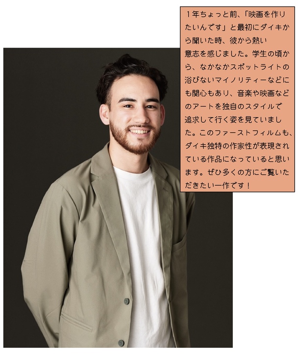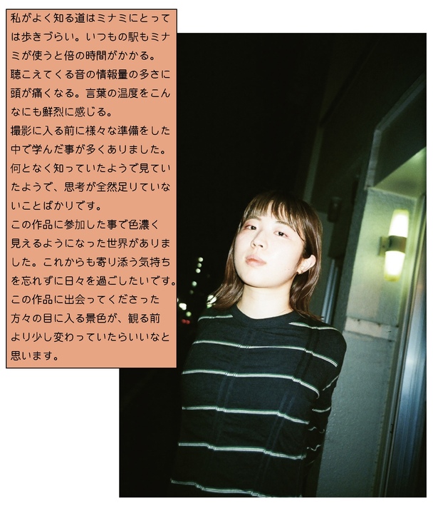 東京都出身。東京国際映画祭コンペティション作品、「曖昧な楽園」(2023)にて主演をつとめる。今作では、笠松さん同様「同行援護従業者養成研修」を受講し、視覚障害者の外出をサポートする「ガイドヘルパー」の資格を取得した。その他、徒歩で日本中の動物園と水族館を回ったことがある。