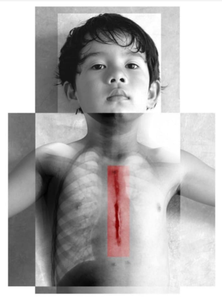 写真家の母による心臓の手術をテーマにしたコラージュ作品