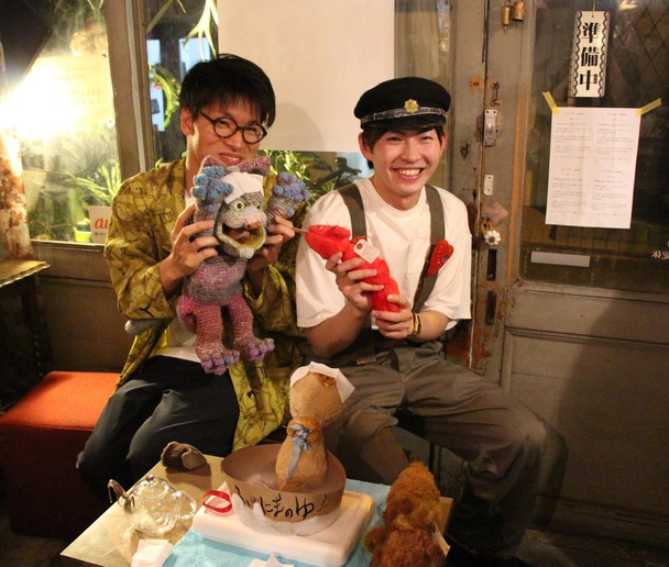 FANTANIMA!in関西 会場の「珈琲舎・書肆/Luftアラビク」と、恒例となったファンミーティング「FANTANIMA!ファイヤー」で、出品作家の横道祐器さん(左)とゆうさくでげすさん(右)