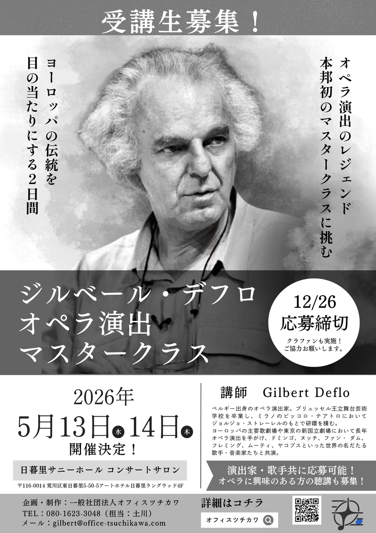 本場ヨーロッパで、長年にわたって活躍してきたレジェンド演出家、ジルベール・デフロが来日!歌舞伎など日本の伝統芸能もこよなく愛するデフロ氏が、ここ日本で、若手演出家/歌手を対象にマスタークラスを行います。