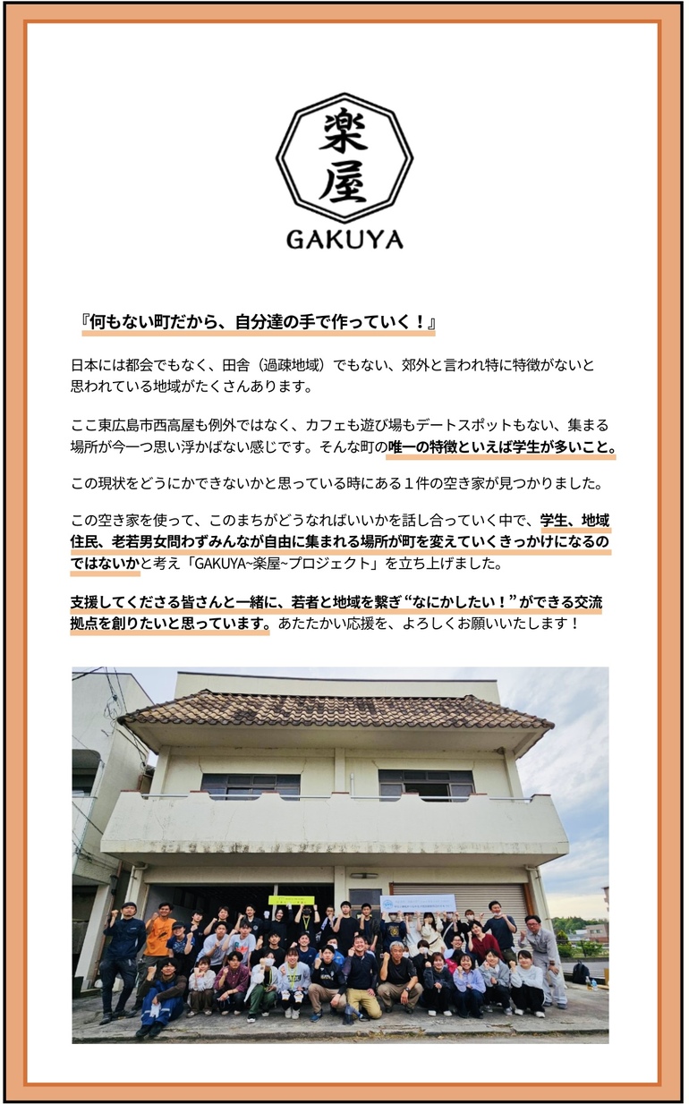 ページをご覧くださりありがとうございます。私たちは、地元の高校生、大学生、まちづくり会社、地元住民、企業、行政、大学など東広島市の西高屋に関わるメンバーで、このたび新たに「GAKUYA~楽屋~プロジェクト」を立ち上げました。今回クラウドファンディングに挑戦することで、この輪を全国に広げていけれたらと思っています。