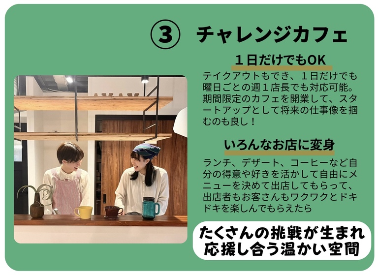 ・リターンでチャレンジカフェを支援すると1日自分のお店を出店することができます!