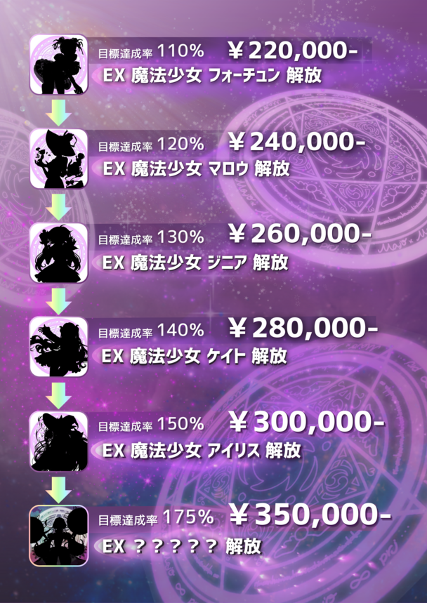 皆様のご支援により、8月2日に目標額を達成し制作が決定致しました!予想以上に早い到達で、本当にありがとうございます!これ以降は、ストレッチゴールを設定し、ゲーム本体を含む支援を頂いた方に、EX(エクストラ)魔法少女を追加でお付けいたします。支援金額により、最大で6枚の魔法少女が追加されますので、引き続きご支援をよろしくお願いいたします(*´ω`*)