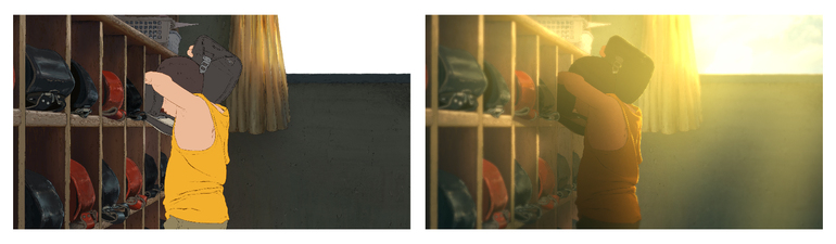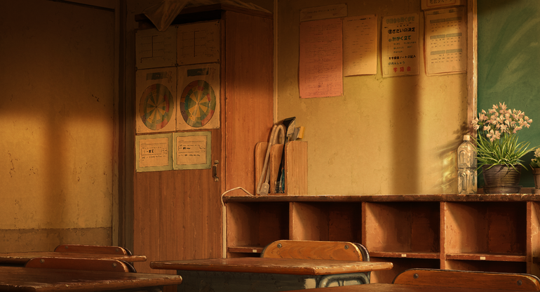 以下は一例ですが、出来上がった原画に服やランドセルの経年劣化を加え、窓の外からの光の加減を調整するだけで見違えるほどクオリティが変わります。