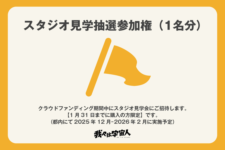 スタジオ見学抽選参加権(1名分)ご支援いただいた方の中から抽選で、クラウドファンディング期間中にスタジオ見学会にご招待します。【1月31日までに購入の方限定】となります。ご了承ください。(都内にて2025年12月〜2026年2月に実施予定)