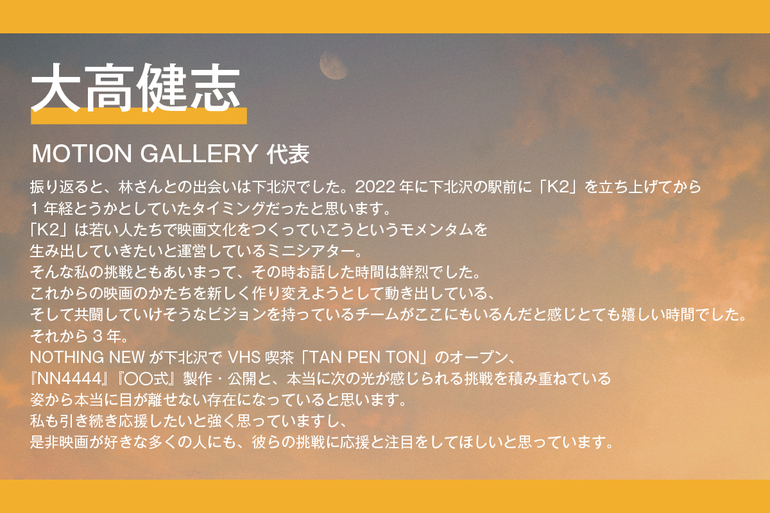本作は、2022年にまだNOTHING NEWという会社すら存在しなかったタイミングから監督の門脇と自分だけの状態で動き出しました。