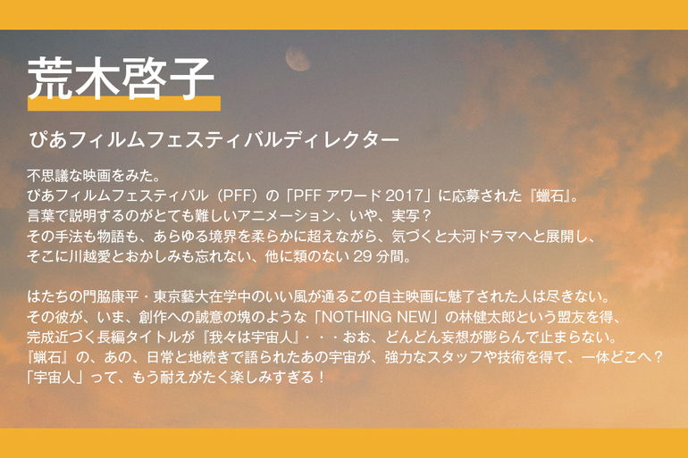 第⼀作『NN4444』はロッ テルダム国際映画祭やクレルモン=フェラン国際短編映画祭、サンフランシスコ国際映画祭 をはじめとする10以上の国際映画祭に選出。下北沢K2での先⾏上映は14⽇間全回満員を記録した。2025年には参列型中編ホラー映画『〇〇式』を公開し、41分の中編作品としては異例のヒットとなった。本作『我々は宇宙人』がNOTHING NEWとして初めての長編アニメーション製作となる。