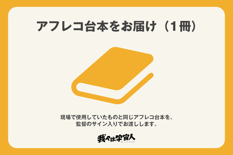 現場で監督やキャスト、スタッフが使用していたものと同じアフレコ台本を、監督のサイン入でお渡しいたします。イベント等で直接お渡しできる場合を除き、お届けは郵送とさせていただきます。