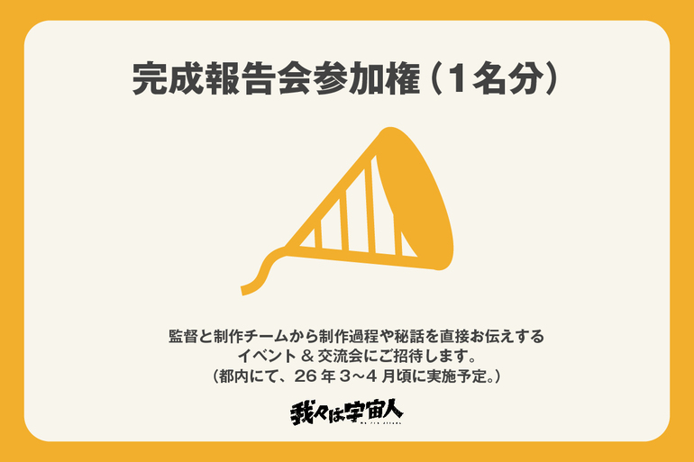 完成報告会参加権(1名分)監督と制作チームから、作品制作過程の裏話や制作に至った想いなどを直接お伝えするイベント&交流会にご招待します。(都内にて、2026年3〜4月頃に実施予定。)