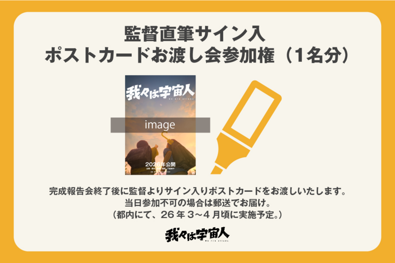 監督直筆サイン入 ポストカードお渡し会参加権(1名分)完成報告会終了後に監督よりサイン入ポストカードをお渡しさせて頂きます。遠方で当日お越しいただけない方には、郵送にてご自宅にお届けさせていただきます。(都内にて、2026年3〜4月頃に実施予定。)