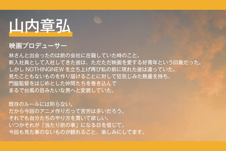 若手監督と新鋭スタジオが挑むオリジナル脚本の長編アニメーション。高いハードルに挑むこの現場を、ともに挑み、ともに喜びを分かち合っていただけたら嬉しいです!