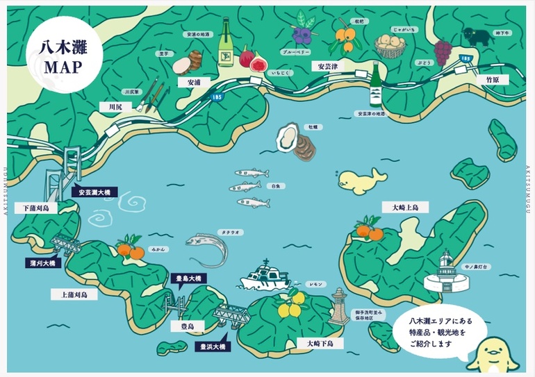 八木灘とは、川尻・安芸津・安浦・竹原・大崎上島・とびしま海道を結ぶ