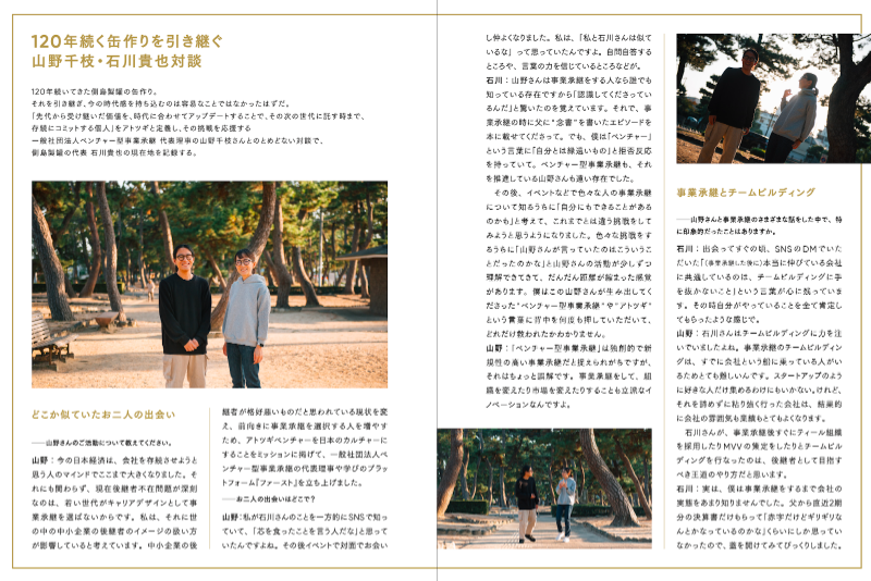 同じ100年以上続く家業持ち同士の石川さん。まっすぐに家業に向き合う姿に憧れを感じていたので、社史の制作をお任せいただいた時は本当に嬉しかったです。缶を作り続ける意義と方法を開拓する姿は、すべてのものづくりに関わる人の心を動かすはず。素敵な社史に仕上がったので、ぜひ支援してください!