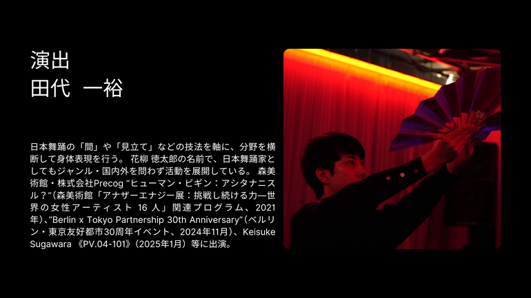 2026年2月末に度文化庁メディア芸術クリエイター育成事業(発表支援)の助成のもと、VR作品「TECH-NOSE-CODE」のプロトタイプ展を予定。2025年11月にはパリのレジデンス・プログラム、XR Vision Residencyに参加し、滞在制作を行う。