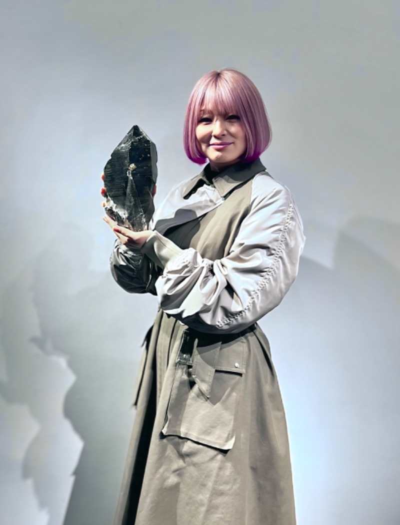 (写真右)収録後、スタジオで大きな黒水晶を持つJun Futamataさん