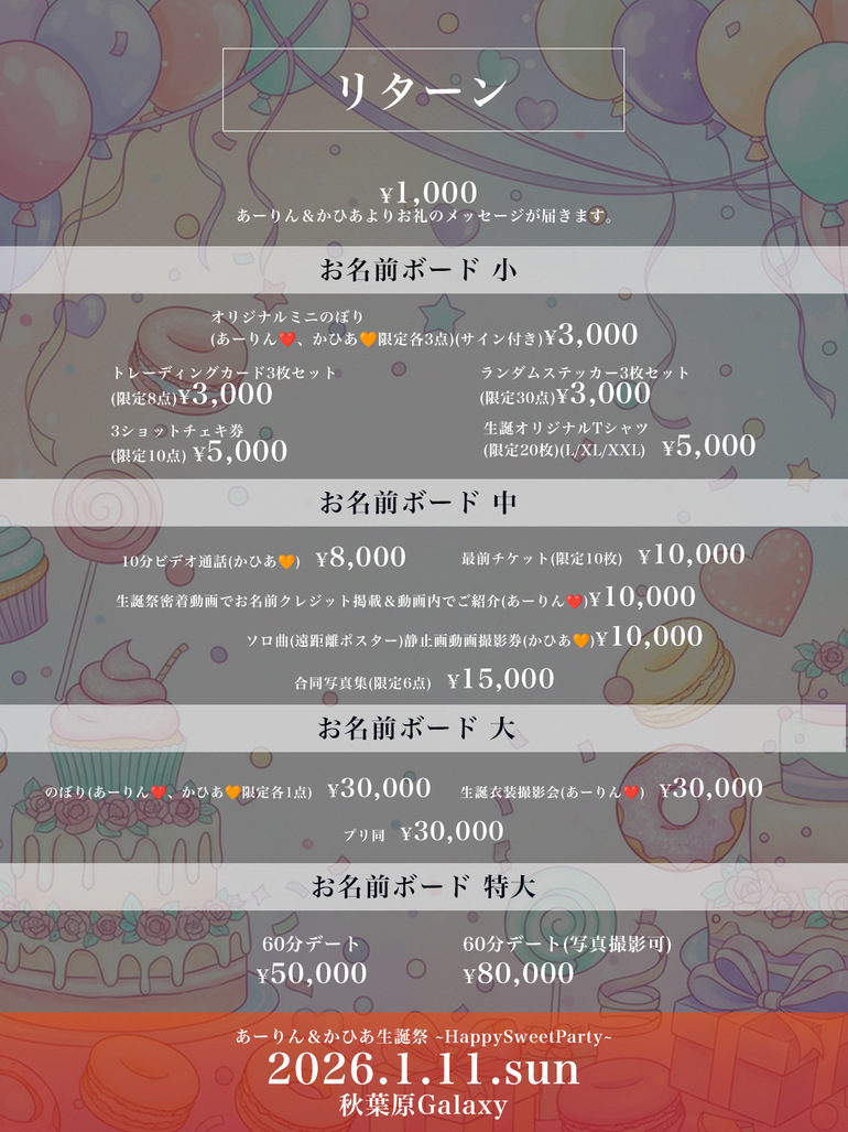 本プロジェクトは、2026年1月11日(日)に秋葉原Galaxyにて開催予定の『あーりん&かひあ生誕祭 ~ Happy Sweet Party ~』に向けて実施いたします。