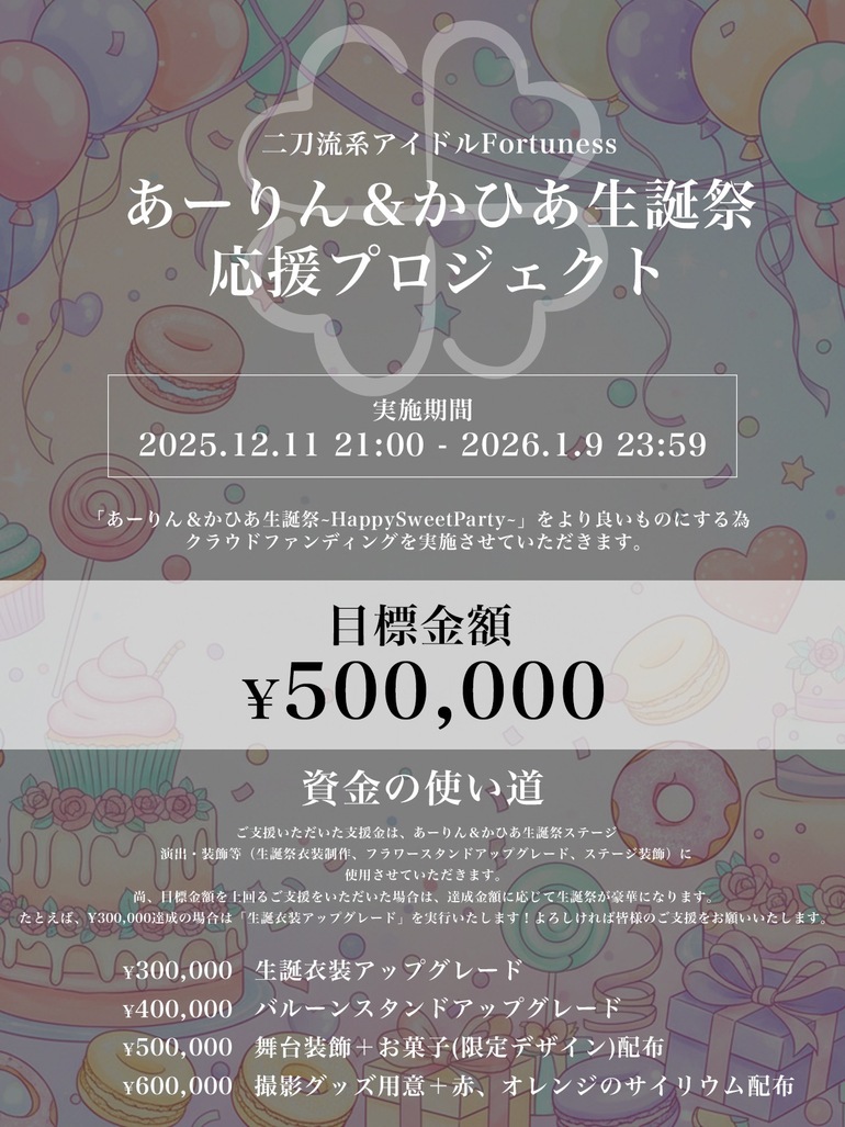 2026年1月11日に開催する『あーりん&かひあ生誕祭 ~HappySweetParty~』を素敵なものにするため、ぜひ支援とご協力をお願いいたします。