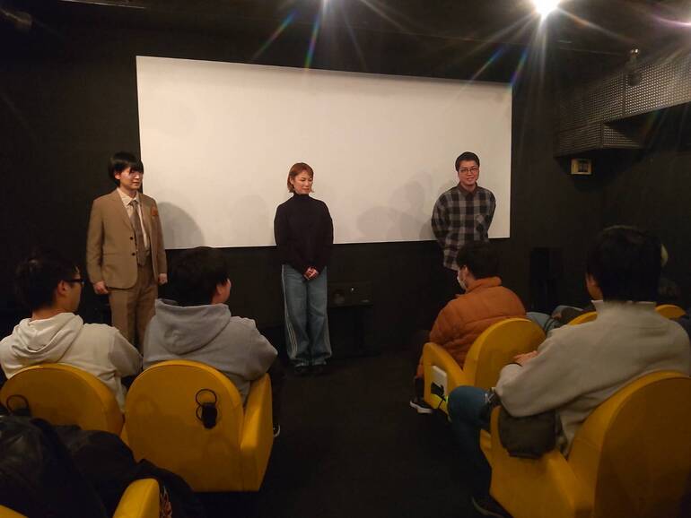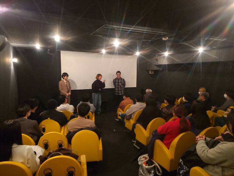 <写真:登壇者の左から今福洋志(兄)監督、伊澤さん、依藤さん。後ろ姿ですが、観覧席の中央先頭に座っている茶色のダウンの方が今福哲志(弟)監督>