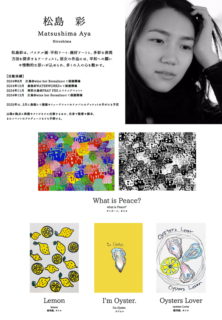 これまで、広島空港での「広島平和80周年記念 Heiwart Project」や呉市クレイトンベイホテルでの個展開催など大きなプロジェクトを実現してきました。