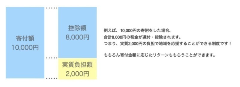 ご自身の「ふるさと」や応援したい地域に対して寄付をすることができる制度です。寄付額から2,000円を除いた額が、寄付者様の所得税と翌年の住民税から控除されます。そのため、寄付者様は 【 実質負担2,000円】で地域を応援することができます。