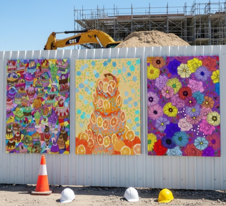 工事現場の壁囲いは大きく無機質ながら、毎日そこを通る人の視界に入ります。「わざわざ予定を立てて行く展示」ではなく、日常の動線上で目に触れるものです。