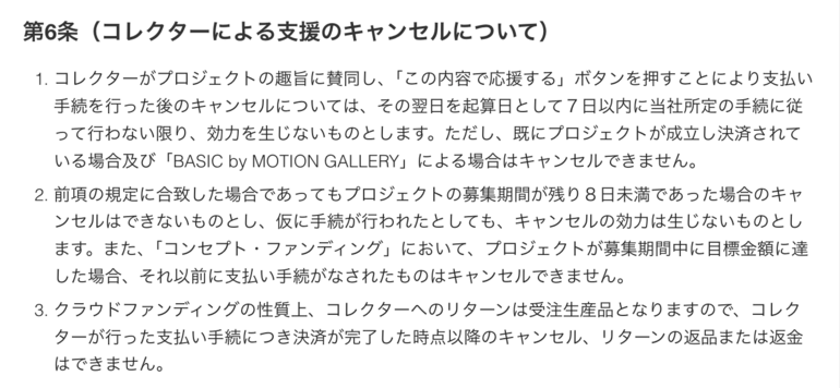 以下、クラファンの利用規約の中に記載されている、キャンセルについての項目と、