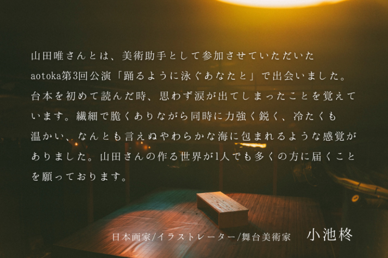 それでも、変わらず作品を創り続け、お客さまに届けていきたいと思っています。そのためにもしご支援してくださる方がいらっしゃいましたら、ぜひお力添えいただけたら嬉しいです。尚、次回公演は現在準備中ですが、2027年中に新作(作・演出 山田唯 / 都内開催予定)を上演予定です。詳細は決定し次第、随時情報公開を行っていきます。