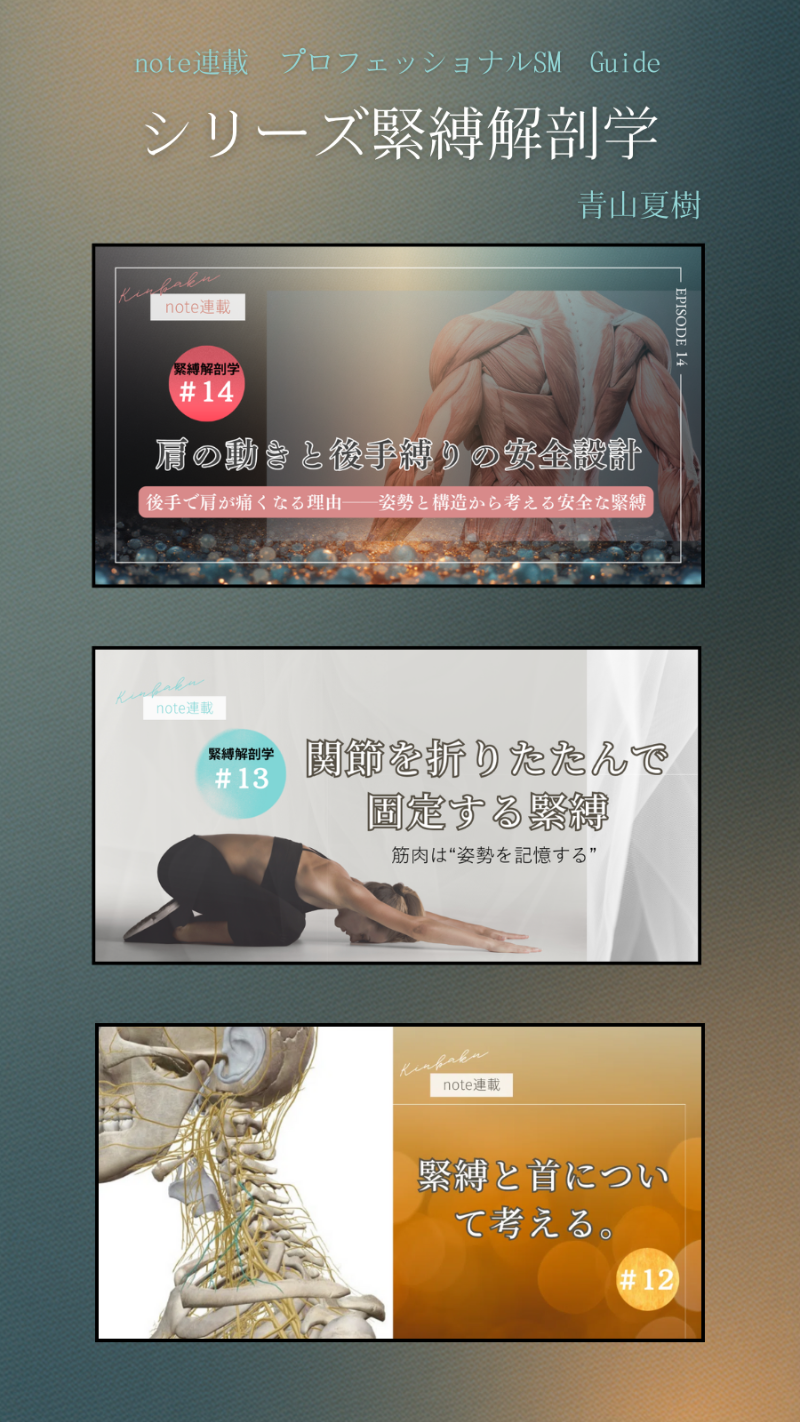 扱っているテーマはさまざまですが、どの記事にも共通しているのは、緊縛を感覚だけで扱わず、身体の構造や負荷のかかり方から考えたいという視点です。