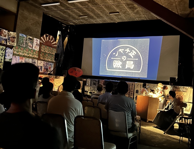 コロナ禍を経て、2025年初夏。やっと念願叶い旭館にて活弁上映。沢山の笑い声が響く中、旭館の壁や屋根、建物には、開館から今日までここに集った人たちの笑いや涙、暮らし、歴史が染み込み、醸造され熟成しているのではなかろうかと感じました。