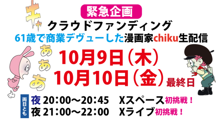下記の日程で、61歳で商業デヴューした漫画家chikuが