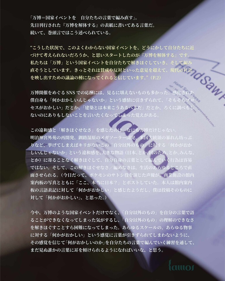こんばんは!『万博を解体する』編集部の木村佳菜子です。