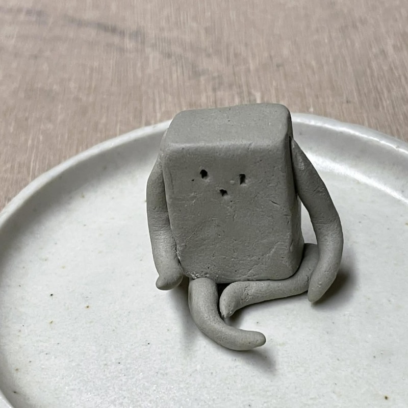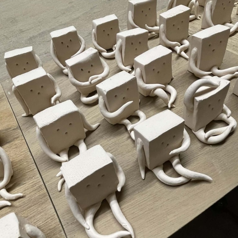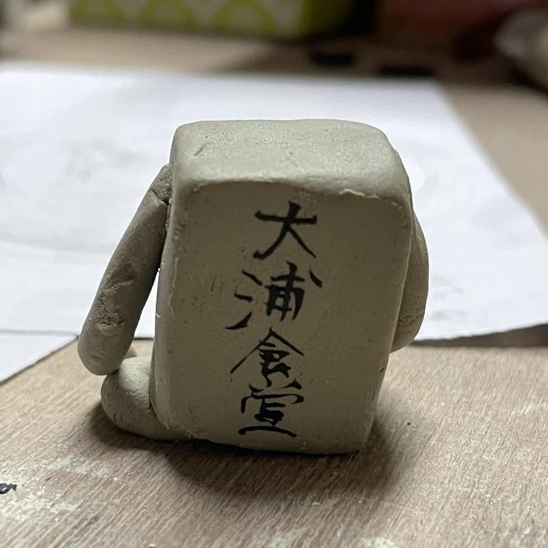焼成前のバタ丼くんは灰色。おわかりだろうか……「豆腐」の頭+胴体から、「もやし」の手足が生えているという造形である。そして、背中に「大浦食堂」の名前を自ら背負っているという……なんとも頼もしい名物メニューだ。