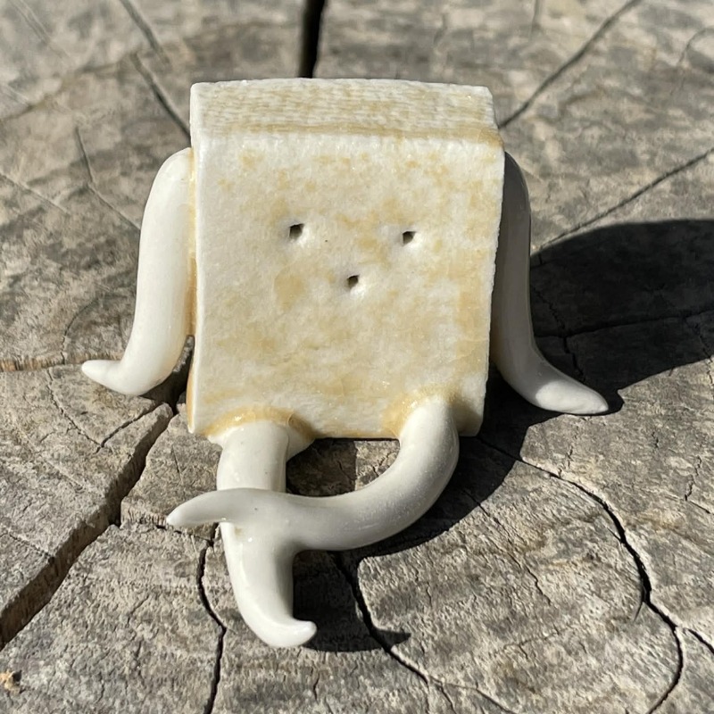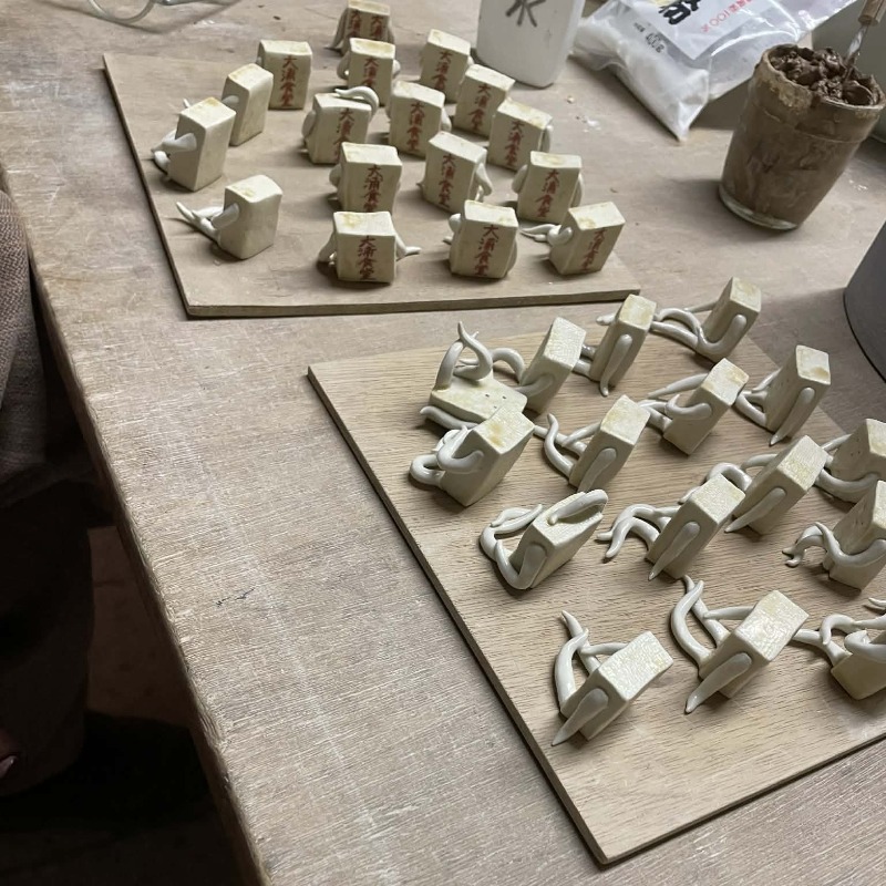 豆腐の焼き色は、釉薬をかけてからの本焼きで再現。「大浦食堂」の文字は、七味唐辛子を連想させる赤色。バタ丼くん……ずっと言おうと思っていたのだが、なんで君はそんなに愛くるしいのだ!!