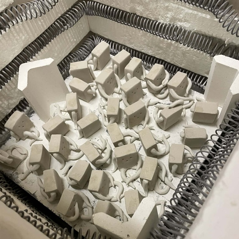 成形と字入れが済んだバタ丼くんは、このように小型の電気窯に並べられて焼かれる。まるでマスターのフライパンで焼かれる豆腐のように……。素焼きが終わると、豆腐色に変貌。