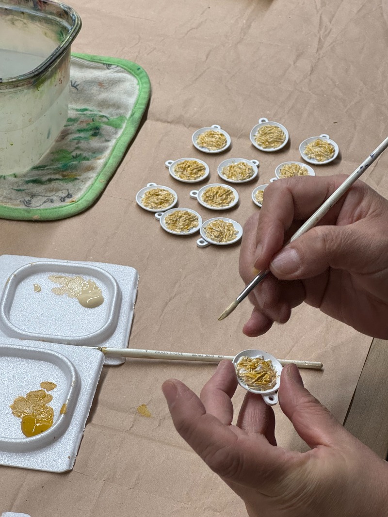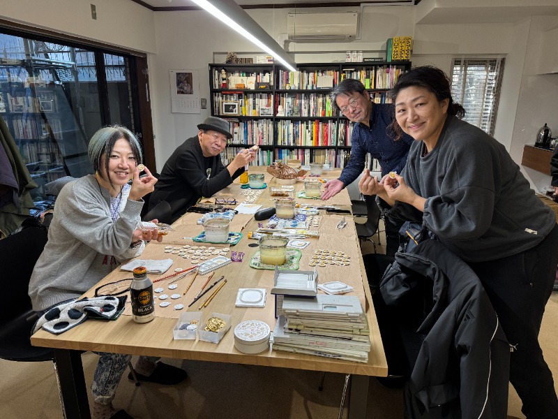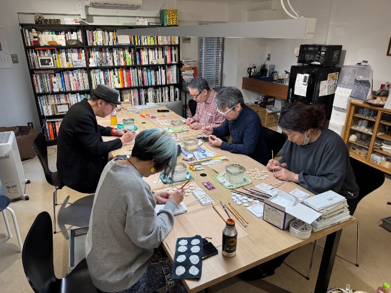 5人で150個に彩色するのにかかった時間は3時間。久しぶりに筆を持つ人も多く、何せ細かい作業なので拡大鏡が必要な人がいたり、みんなで拡大鏡を回してみたり……。
