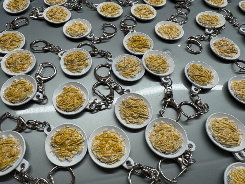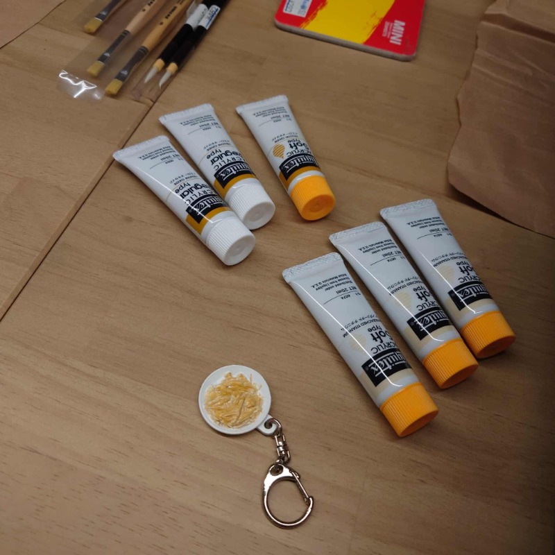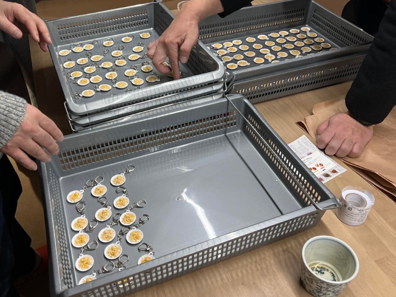 さて、3連休の最終日である23日(月祝)に、愛好会のメンバーで「バタ丼」キーホルダーの彩色を行いました。