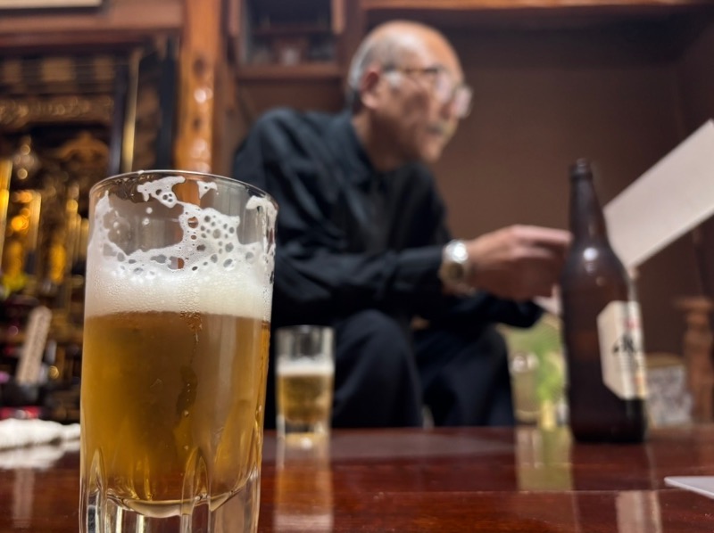 写真は、マスターのご実家でインタビューをしたときのもの。東京のご自宅であれ、長野のご実家であれ、取材をする際は必ずビールが注がれて乾杯から始まる。これがマスターの流儀です!