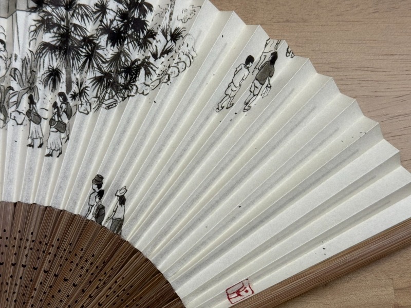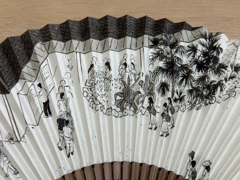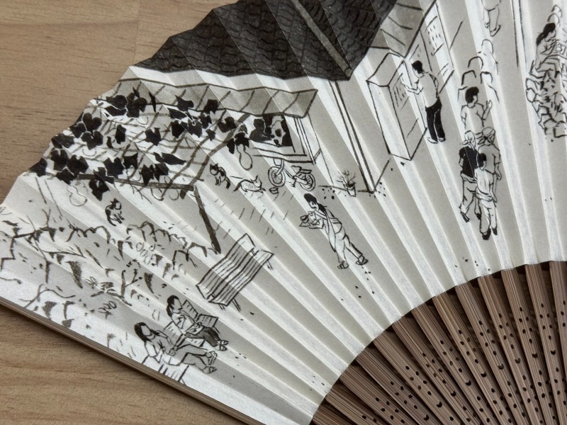 今日は、リターン品の完成のご報告です。画家・磯部光太郎さんの《大浦食堂前鳥瞰図》を扇子に仕立ててみました! これが最後のリターン品の納品となります。