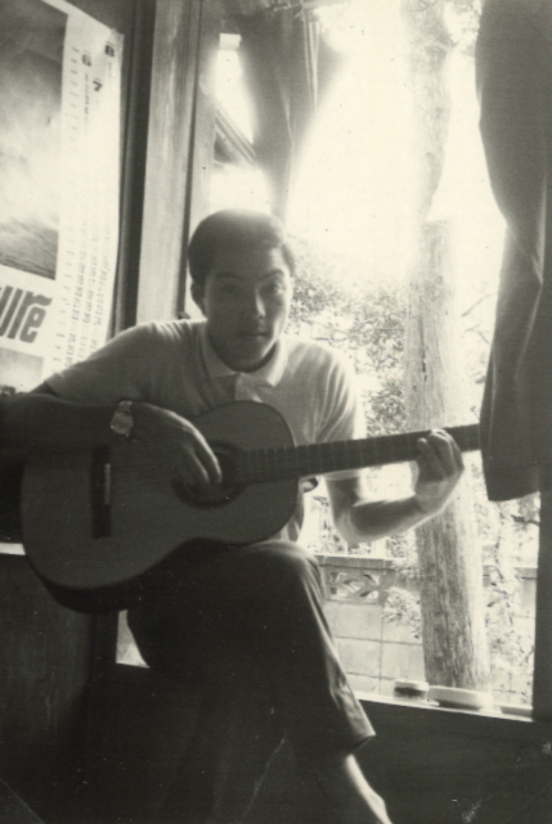 今日はこの写真。明治大学の寮の部屋で写された一枚です。ギターを抱えて足を組むマスター。一緒にアルバムを見ているときにはこんな会話になりました。