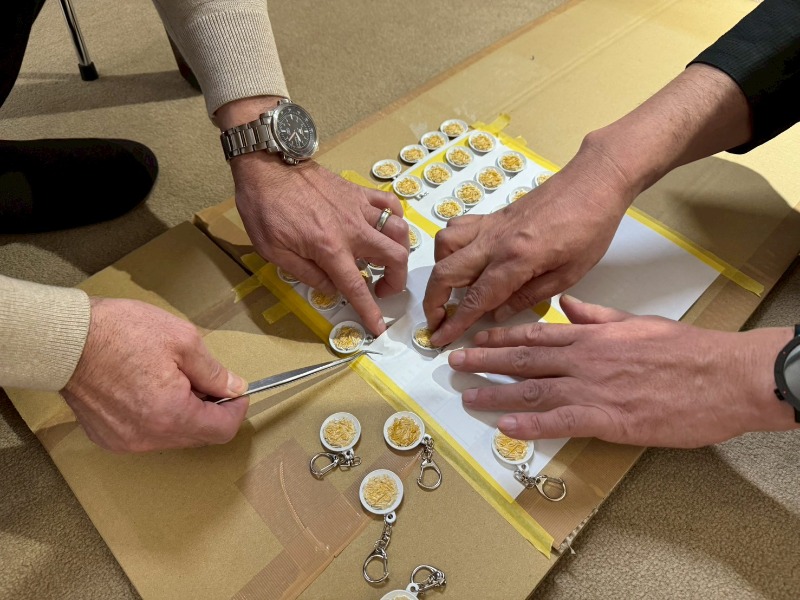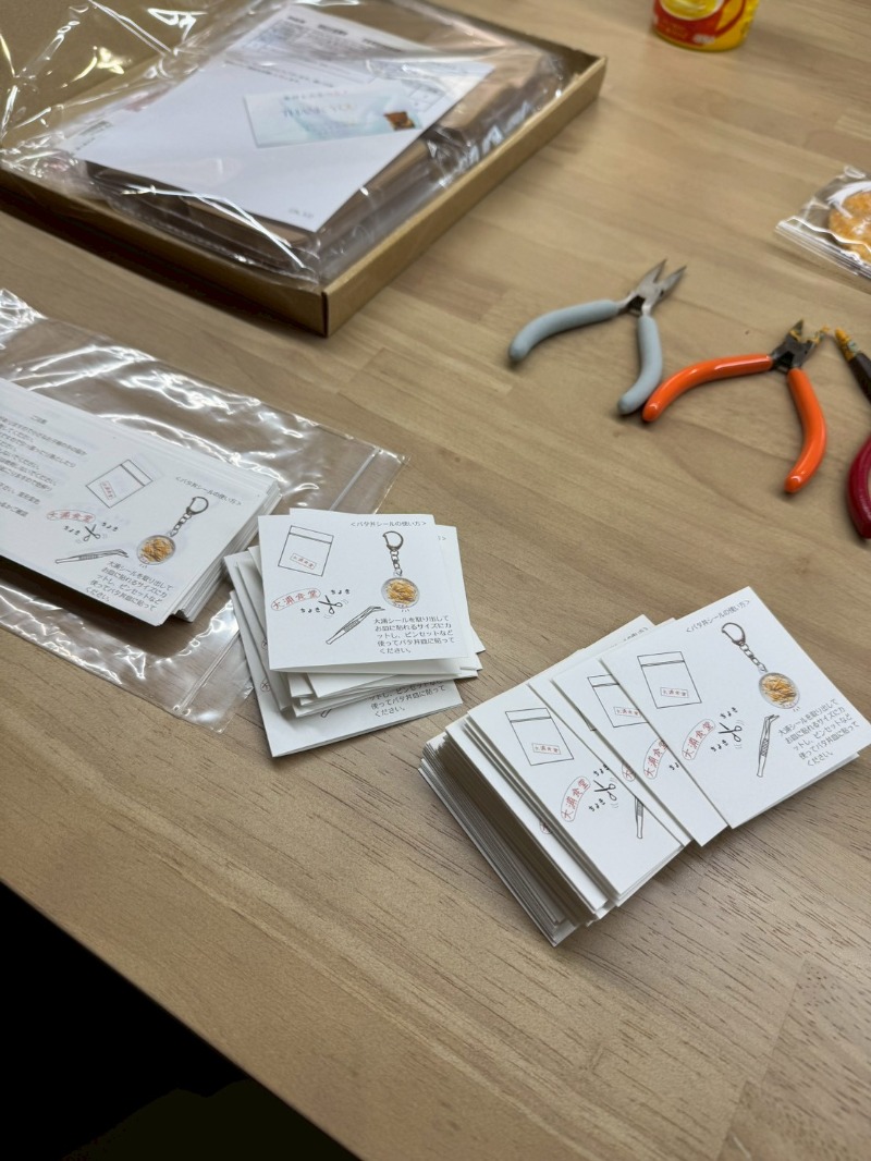 さて、皆さんはこの3連休をどのように過ごされたでしょうか。東京は桜が開花し、お花見に出かけた方も多いはずです。そんな春を満喫すべき季節に、私たちバタ丼愛好会は、室内でいそいそとある作業に没頭していました。作業というのは、「バタ丼」キーホルダーの包装であります!