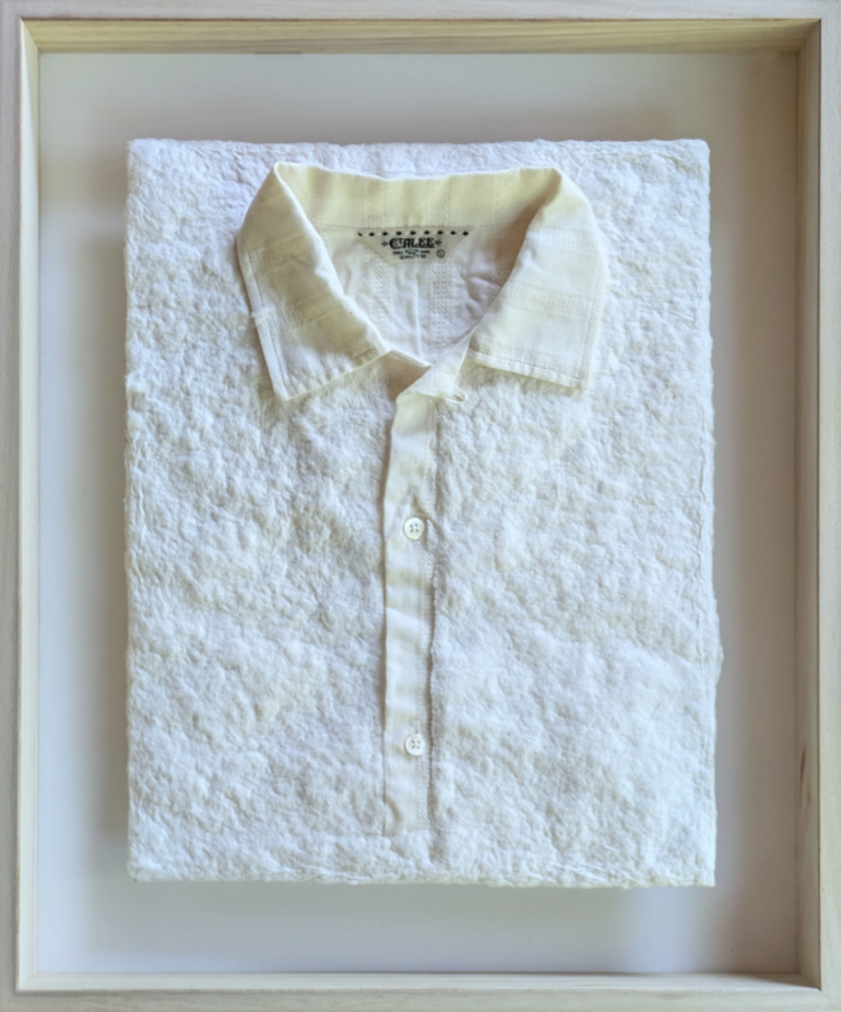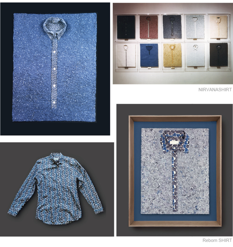 《Reborn SHIRT》は、着るという役目を終えた一着のシャツを解体し、手漉き和紙の技法によって再生するアート作品シリーズです。そこには、持ち主の身体の記憶や生活の痕跡、共に過ご した時間が静かに封じ込められています。ものが持つ機能を超えた美しさは、「解脱したシャツ」 という作品名で発表され、1997 年「今立現代美術紙展」において日本紙アカデミー賞に選出さ れました。