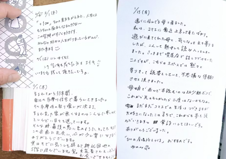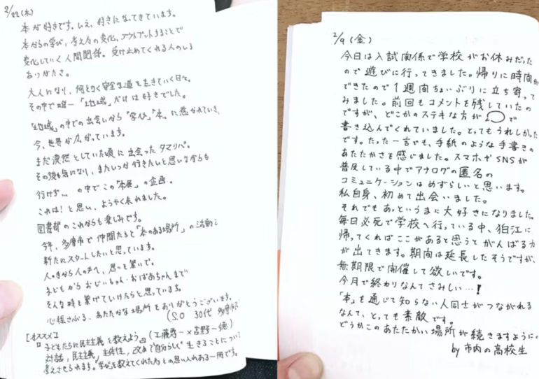 そこに綴られていたのは、「受験勉強中の気分転換できました」「本があるだけで、なんだか安心しました」「初めての一人暮らしをするこの街に、こんな場所があってうれしい」といった、日々の暮らしからこぼれ落ちたような言葉たちでした。しかも、その多くがノートいっぱいを使って、びっしりと書き込まれていたのです。