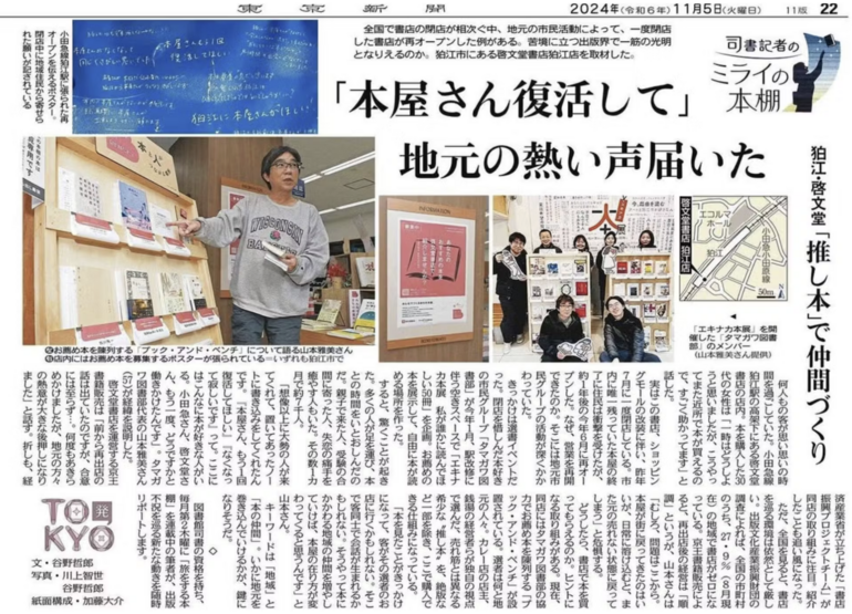 一昨年、山本さんを取材しました。タマガワ図書部の取り組みがきっかけで再オープンした「啓文堂(現・紀伊国屋)書店狛江店」の記事を書くためでした。一度閉店した書店が復活するのは、全国でも珍しく、当時の経済産業省が注目し、称賛したのを覚えています。