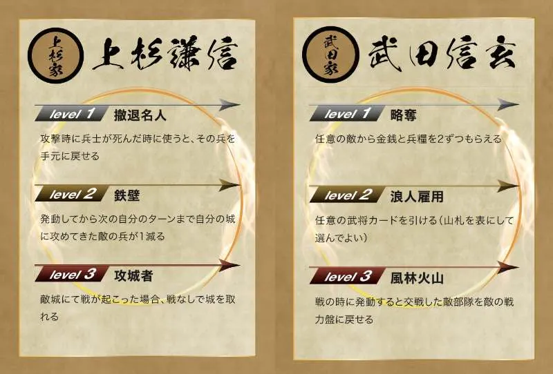 それぞれの武将にはレベルごとの能力がついており、武将カードを使用することで敵の部隊を戦前に減らすことができたり、城を強化し防衛力を高めたりすることができます。他には、戦場での行軍速度を高めたり、敵に攻城戦を有利にすることができる脳梁を持っています。