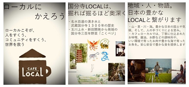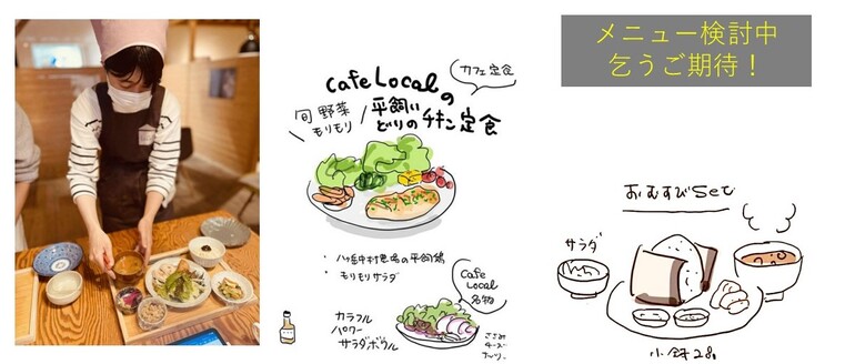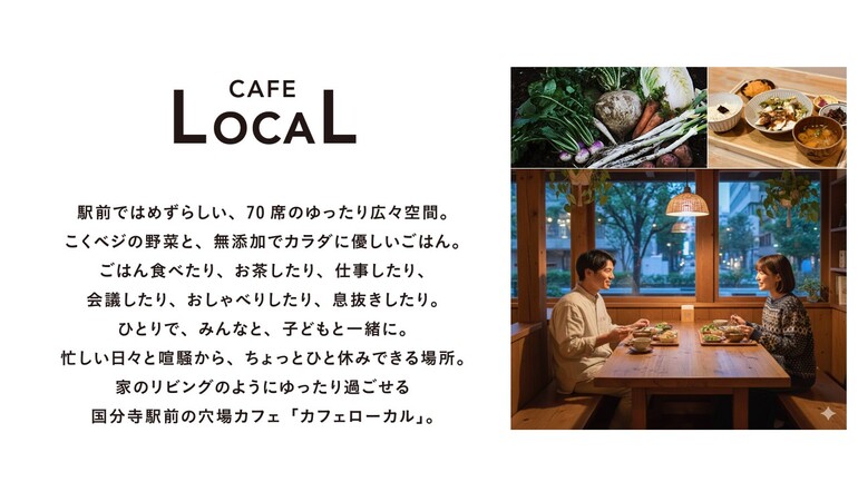 カフェローカルは、カフェスローの姉妹店として、安心安全に気を遣い、毎日食べても飽きない、季節替わりの地場野菜を使い、地元に向き合ってきたカフェ。素敵な笑顔・接客や美味しい料理を振舞う凄腕チーム。場所も国分寺駅ビル5階ココブンジプラザ内で、街に繰り出す玄関口。国分寺の地域パワーや場所ポテンシャルを、もっと発揮できるのでは!?と内部議論を重ね、この度、「良き点」を残しつつ、お客様に快適に美味しくお過ごし頂く「アップデート」すべく、リニューアルに挑戦することになりました。