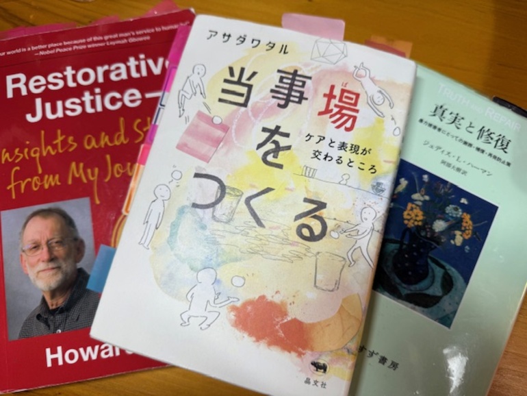 私は、修復的アプローチやコミュニテイのあり方に思いを巡らせてながら、アサダさんのご著書を読んだので、少しその話にも触れました。トークの時、傍に置いていたのは、こんな本たちです。